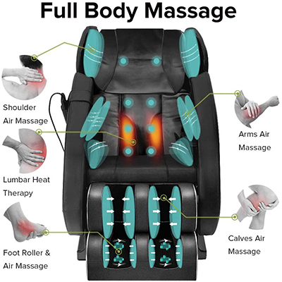 • Full Body Massage: Airbags placed over shoulders, arms ,buttocks ,legs and feet, ease tension and relieve muscle fatigue by inflating and deflating. 8 fixed rollers to back rest, back and waist massage forward and reverse.