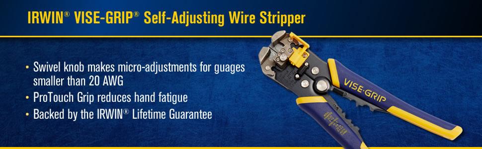 The IRWIN VISE-GRIP Self-Adjusting Stripper, 8", makes stripping wire from 10-24 AWG easier than ever. It has a self-adjusting mechanism and a swivel knob for micro-adjustments for gauges smaller than 20 AWG. The wire crimper crimps 22 AWG insulated, 10-22 AWG non-insulated, and 7-9mm terminals. With a wire cutter and ProTouch Grips for maximum comfort and reduced hand fatigue, it is backed by the IRWIN Lifetime Guarantee.
