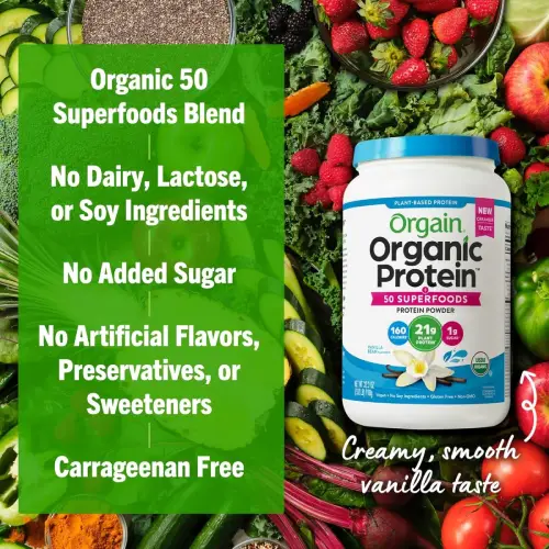 • Ingredients: Organic plant-based proteins, superfoods blend, natural vanilla flavor, and other supporting ingredients